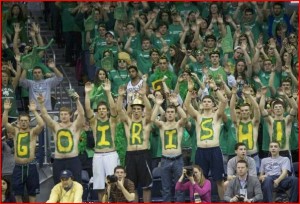Actually almost every one of the students was wearing green…you just can’t see their shirts in the moshpit. Additionally, nonstudents stormed from the other side of the court. I see your point, and truly shirt colors don’t matter…but it tends to be that when fans are united in one color they are emboldened and get rowdier. Just my opinion though.