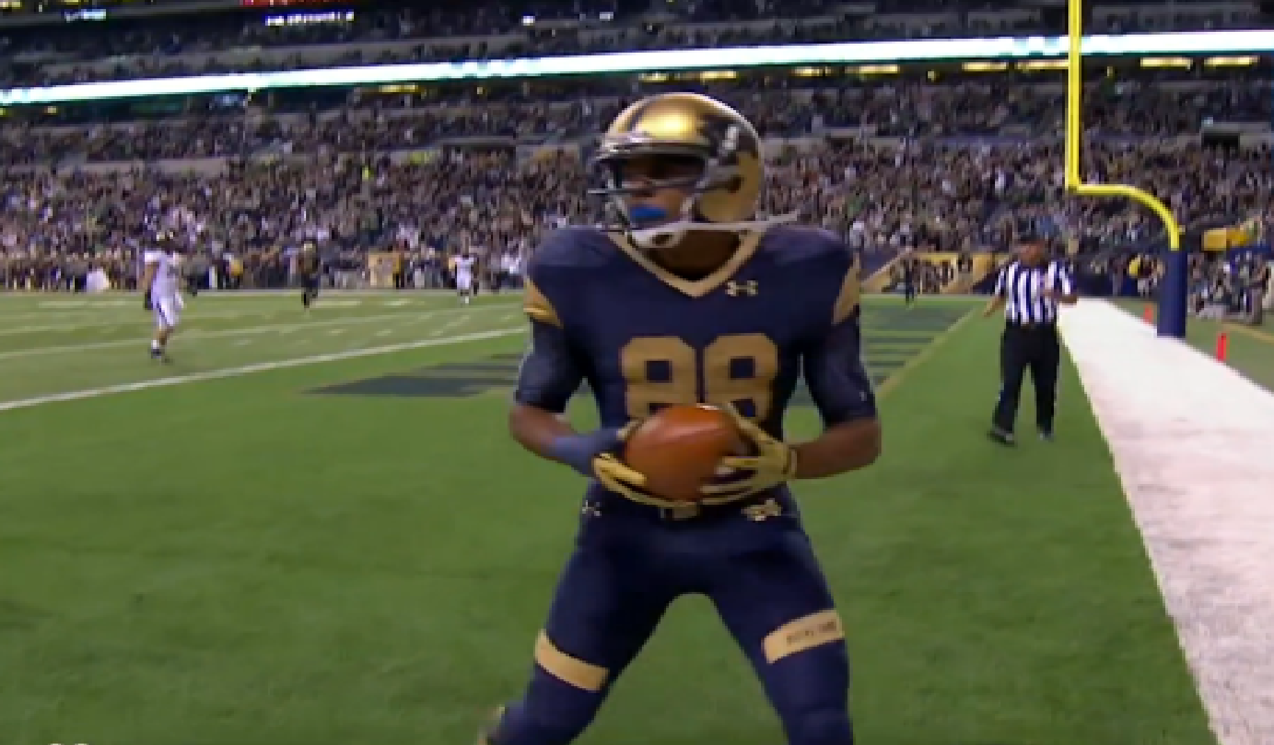 With Notre Dame clinging to a three-point lead late in the third quarter against the Boilermakers, Everett Golson connected with Corey Robinson for a 15-yard touchdown. The touchdown was Robinson’s first of the season and is a good example of how Notre Dame uses the “Slash” concept in the red zone.